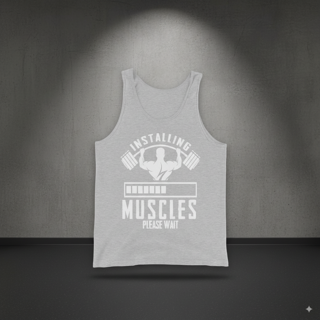 Progress takes time… and a lot of iron. The Installing Muscles singlet is made for those still “loading” their dream physique. Lightweight and breathable, it keeps you comfortable from your first warm-up set to your final rep. Wide armholes give you room to move, while the bold print reminds everyone that gains are always in progress.
